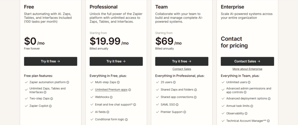 Zapier charges per task (every action = 1 task). A 4 step Zap running 100x/month = 400 tasks.